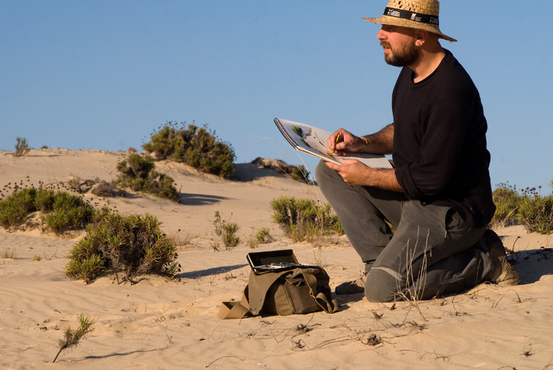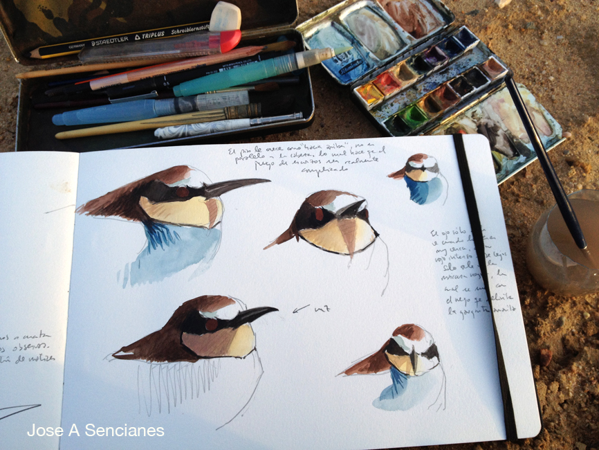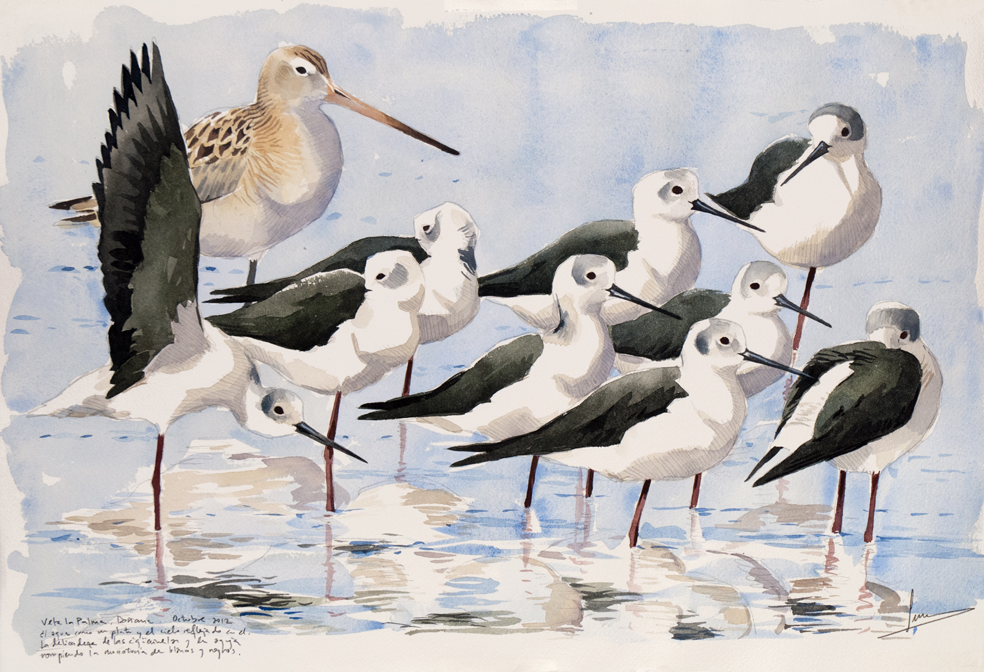 – Cuando era niño, los animales que más me gustaban eran los grandes mamíferos, ciervos, jabalíes, lobos, muflones, osos… centraban todo mi interés. Con el tiempo, me fui interesando más por las aves, quizás por la gran cantidad de especies y de la facilidad para observarlas en estado salvaje. Como explicaba antes, mi trabajo se basa en la observación directa, es decir, salir al campo a pintar. Esta circunstancia, con mamíferos, es realmente complicada porque la mayoría de ellos tienen hábitos más nocturnos y son mas tímidos en su comportamiento. Especie de ave preferida no tengo, pero sí grupos de especies. Me interesan mucho los limícolas, sus concentraciones masivas en invernada o en migración. Me atraen mucho también las anátidas o las colonias de ardeidos, las gaviotas, charranes… las aves acuáticas por lo general son las que me gusta pintar más, quizás porque es lo más cercano que tengo. Creo que no hay ave más difícil que otra para dibujar. Para mí lo que hace difícil una obra es la composición, la luz, el ambiente…por eso siempre estoy buscando nuevos temas y luces diferentes, viajando a donde haga falta o donde crea que puedo encontrar inspiración para ello. Por suerte, he podido viajar bastante y siempre llevo conmigo mi cuaderno y mis acuarelas.